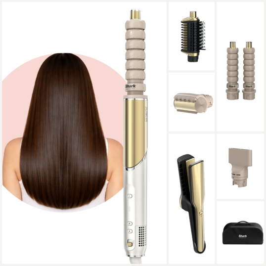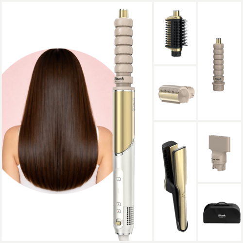 Cu finisaj auriu, Shark Glam combină funcționalitatea cu eleganța. Setul complet include tot ce aveți nevoie: uscător, concentrator, ondulatoare cu efect Coanda, placă de păr Shark Silki, perie cu aer cald pentru volum Shark Glossi, instrument de netezire împotriva firelor rebele și husa de depozitare. Rezultatele sunt ultra-strălucitoare, rapide și fără efort, cu grijă maximă pentru sănătatea părului.